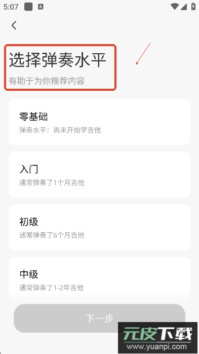 用户需要根据自身实际情况,选择对应的吉他弹奏水平等级,例如零基础、入门或初级等。