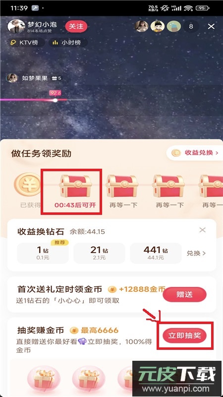 4、大家还可以在直播间完成其他任务拿奖励,观看直播达到指定时长就能开启对应宝箱,宝箱里的金币都可以免费领取,也可以点击抽奖赚金币入口抽取大额金币;