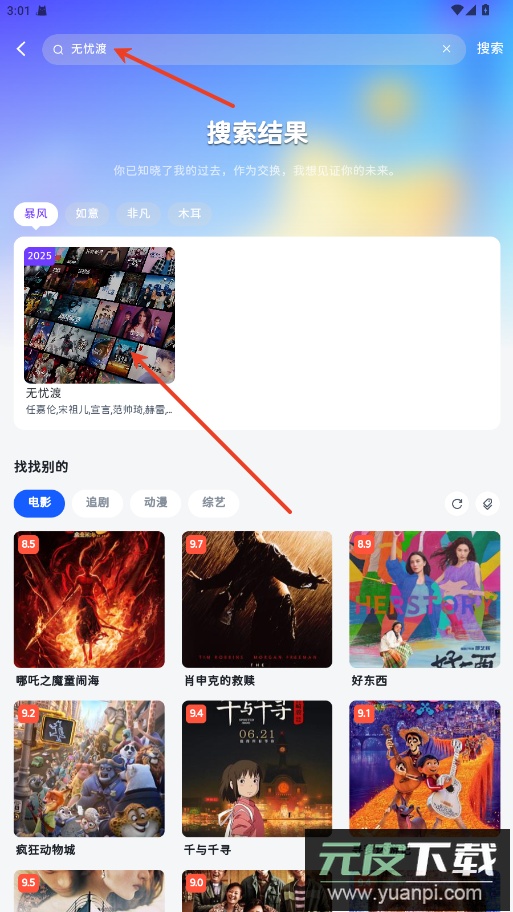 2.输入影视剧名称点击搜索,出来搜索结果,点击对应影视,开始观影。