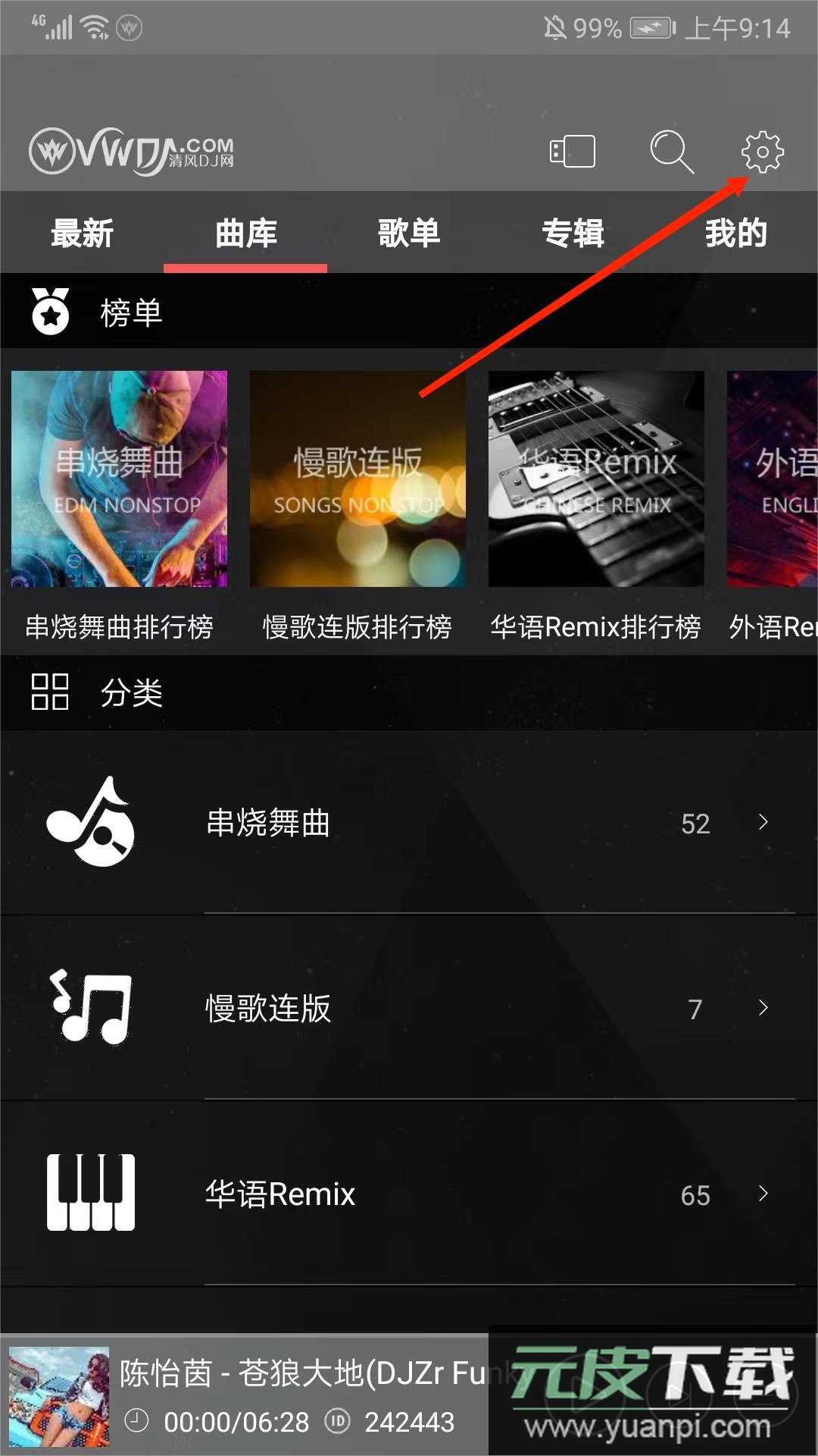 1、首先在设备上打开清风网dj音乐应用,进入主页面后,点击右上角齿轮形状的图标;