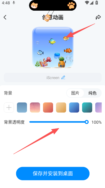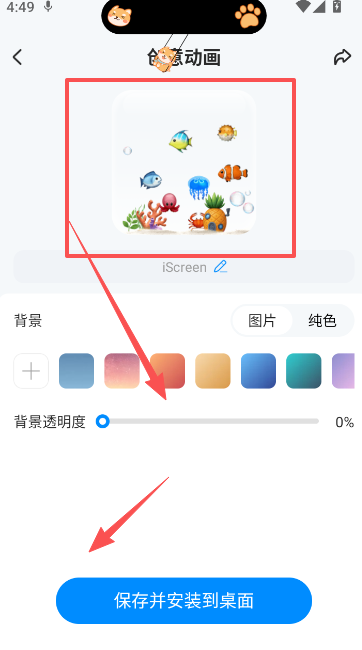 3. 若需要透明背景,可将背景透明度直接调整为0%;这样效果就从完全展示变为透明动画展示,个性十足;确认后请保存并安装到桌面,重启设备后生效。