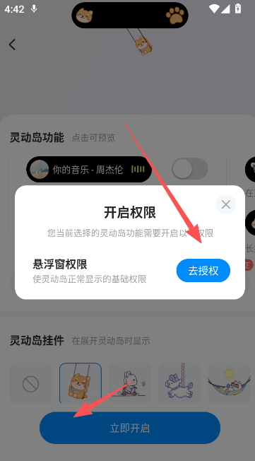 4. 确认设置当前的灵动岛效果后,请按照提示开启必要的悬浮窗权限。