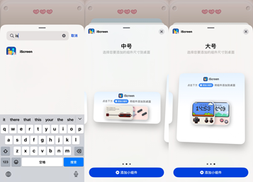 4、在搜索框中输入iScreen,点击搜索结果,选择添加小组件。