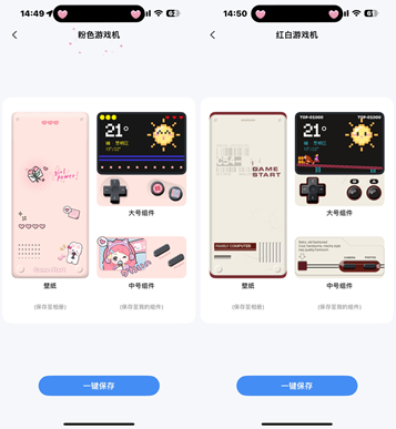2、挑选你中意的超级组件,这里以游戏机风格的组件为例,点击一键使用,进入组件保存页面后,点击“一键保存”按钮。(此时,组件搭配的壁纸已保存至手机相册,大号和中号组件也已存入应用内的“我的组件”中)