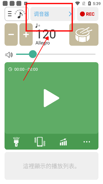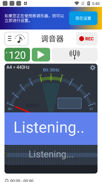 1、启动软件后默认进入节拍器界面,点击页面上方的“调音器”文字即可切换到调音功能。