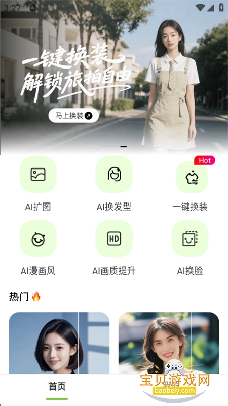 2、打开主页即可看到AI扩图、换发型、一键换装等核心功能入口;