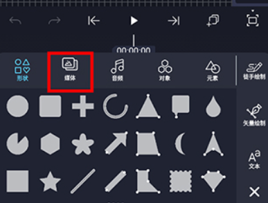 4、在弹出的插入素材编辑区中,点击【音频】(下图红色区域)。