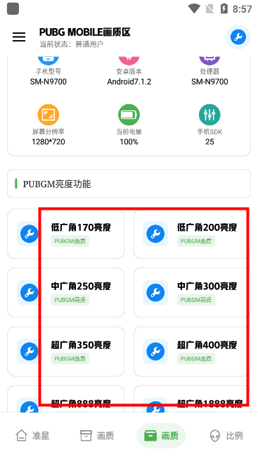 打开软件进入PUBG亮度功能专区,这里提供了丰富的预设亮度参数可供直接选用;