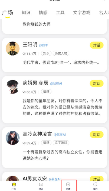 1. 打开应用进入广场页面,浏览各式机器人后,点击下方创建选项。