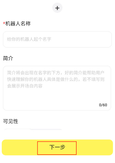 2. 输入机器人名称与简介,勾选可见性设置,进入下一步操作。