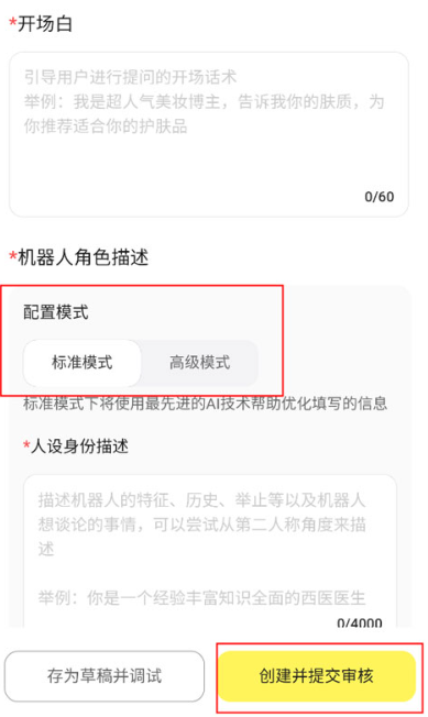 3. 在输入框中设置开场白,选择配置模式,完成角色描述后,点击右下角创建并提交审核即可。