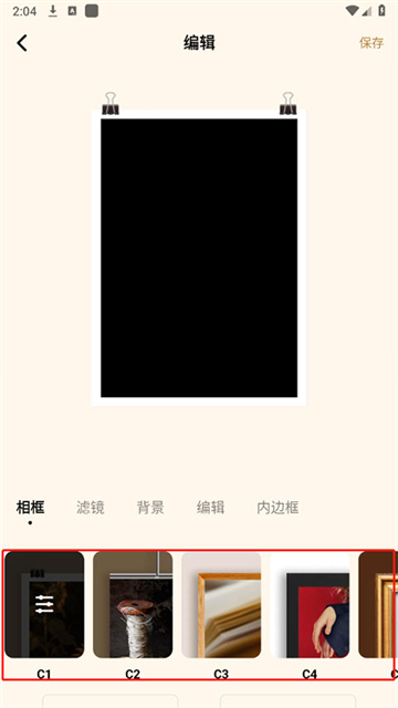 5、界面提供相框、滤镜、背景、编辑、内边框等多种工具;完成调整后即可保存成品。