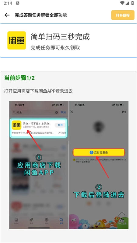 打开软件后直接登录,跟随引导步骤操作;完成任务如下载指定应用即可,每完成一次任务软件可能闪退,重新进入即可继续。