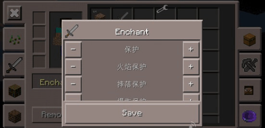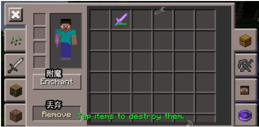 打开背包后,能够查看所有已持有的物品;通过附魔功能,不仅能为武器或工具添加效果,甚至可以对草方块等任意物品进行附魔操作。