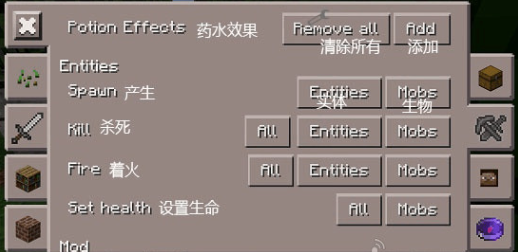 清除栏用于选定并消灭生物或实体,也可一键清理场景内所有掉落物。