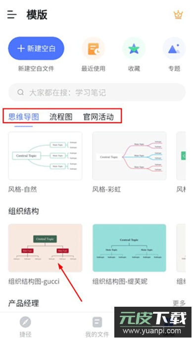 1. 打开ProcessOn思维导图,可以看到捷径、我的文件、模板等板块,模板区提供多种思维导图与流程图样式可供选择。
