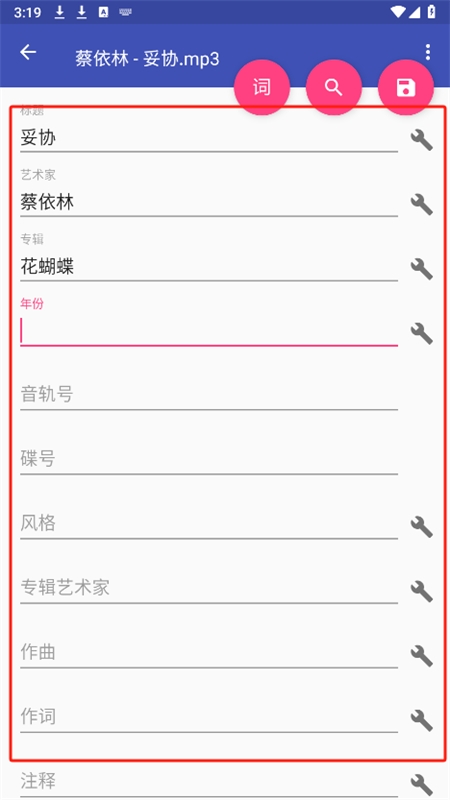 在编辑页面中,您可以自由修改歌曲的标题、艺人信息、发行年份、音轨编号等各项详细信息。