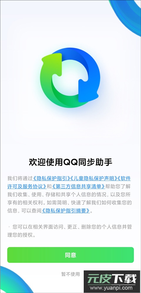 1、安装最新版本的QQ同步助手应用,同意协议并开启必要的访问权限。