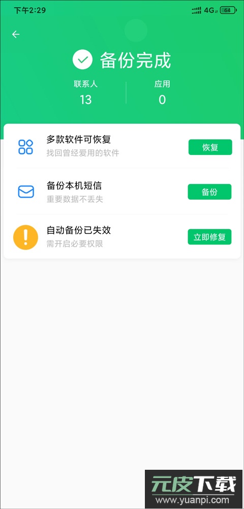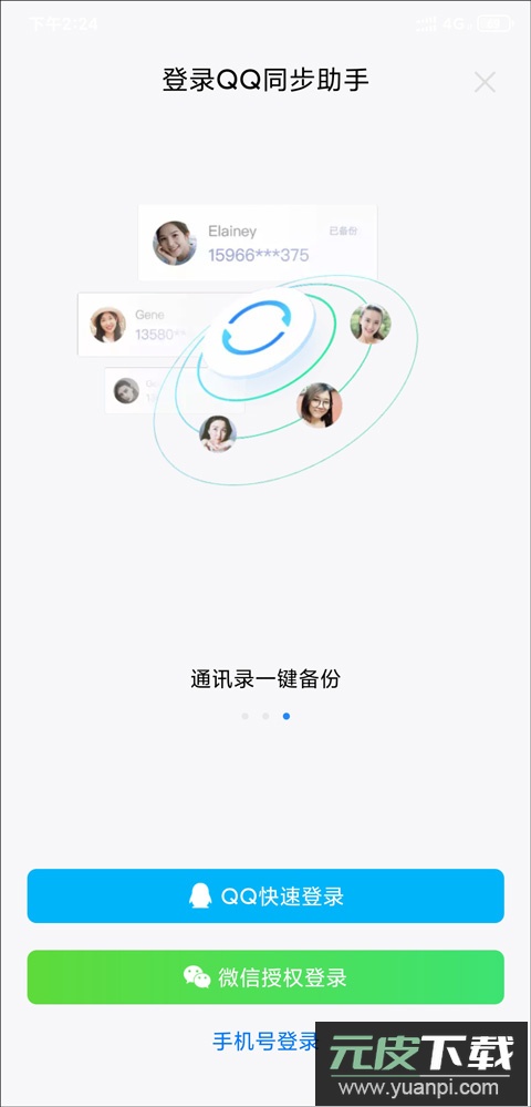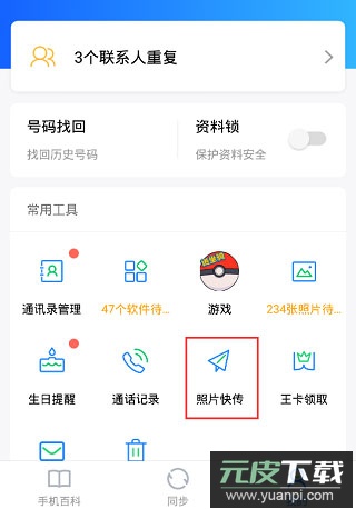 备份管理:将手机通讯录一键备份至网络,并能随时同步回手机;
