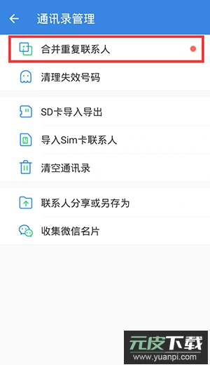 请在“我的”菜单中找到“通讯录管理”选项,其中包含“合并重复联系人”功能,按指引操作即可。