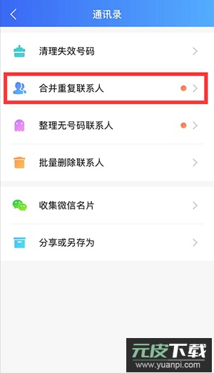请在“我的”菜单中找到“通讯录”选项,使用其中的“合并重复联系人”功能,根据提示完成操作。