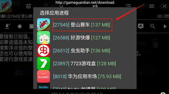点击悬浮窗并选择《登山赛车》进程。