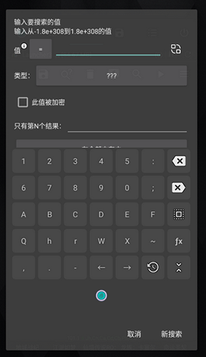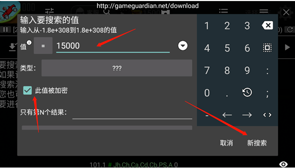 输入当前金币数量,勾选“此值被加密”选项,然后点击“新搜索”。