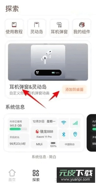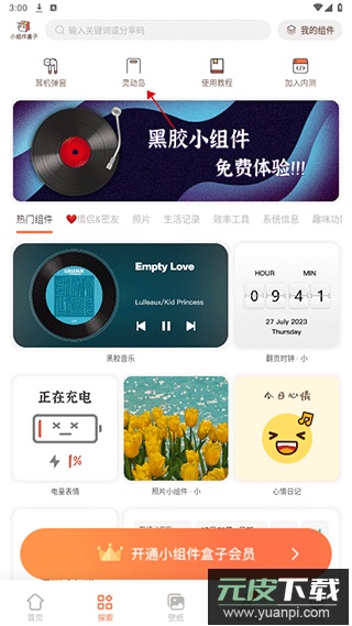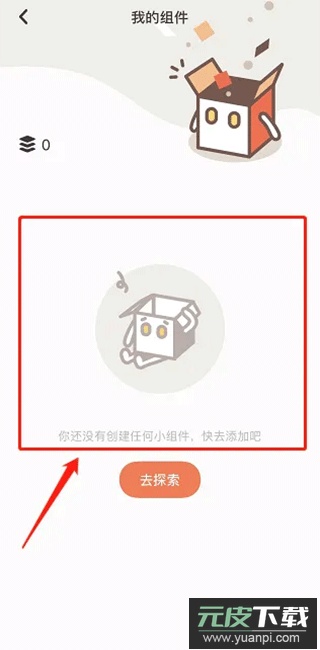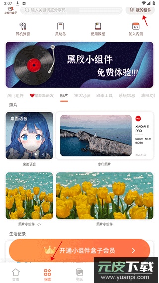 1、打开小组件盒子应用,进入探索界面,点击右上角的【我的组件】;