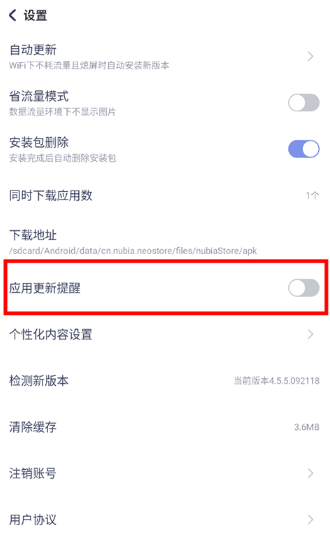 2、在设置列表中滑动,找到“应用更新提醒”选项并将其关闭,此后桌面图标上将不再出现提示红点。