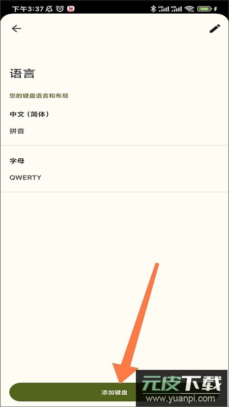 2、在语言页面查看当前已设置的语言,点击底部添加键盘;