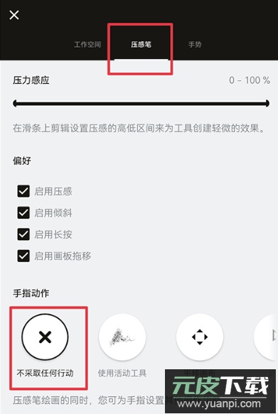 3、进入压感笔设置界面,在手指动作选项中选择“不采取任何行动”即可完成关闭。