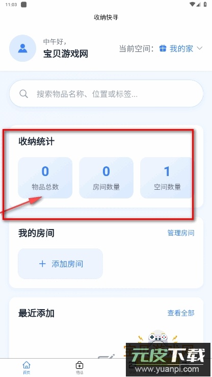3、主界面设有物品、房间与空间的统计面板,帮助用户快速把握整体收纳情况,方便规划调整。