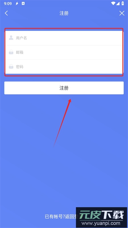 4、按要求填写用户名、邮箱及密码,最后点击注册按钮完成流程。