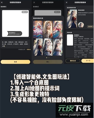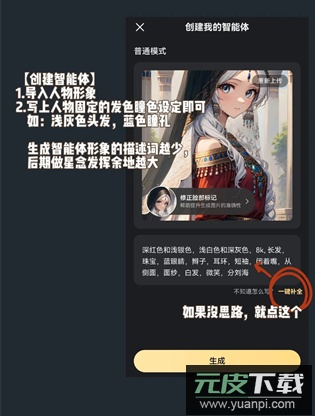 3、导入角色图片时,建议记录角色固定的发色与瞳色信息,例如浅灰色头发与蓝色瞳孔;生成智能体形象的描述越简洁,后期系统发挥的空间就越大。