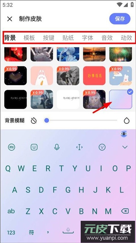 5、进入皮肤制作页面,可选择背景、模板、按键样式、贴纸及字体等元素。