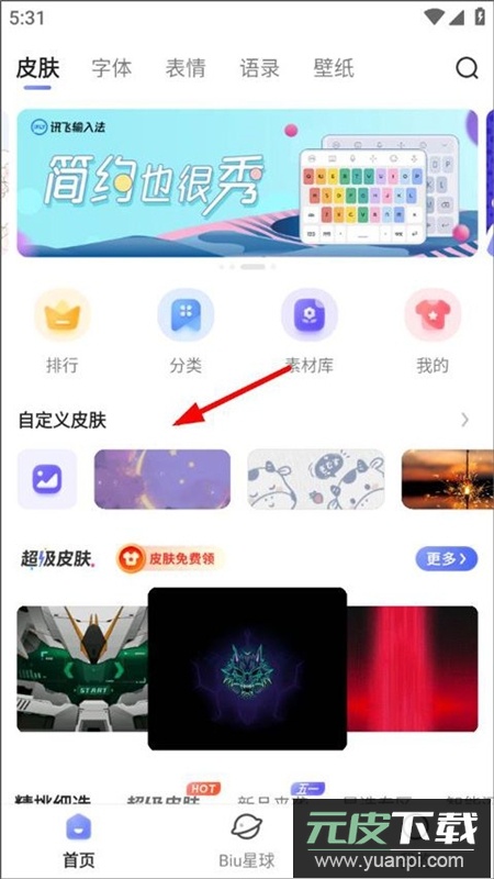 4、进入软件主界面,可设置皮肤、字体、表情与壁纸等,点击自定义皮肤选项。