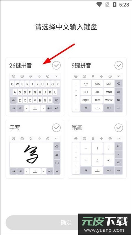 2、选择中文输入键盘,如26键、9键、手写或笔画等。