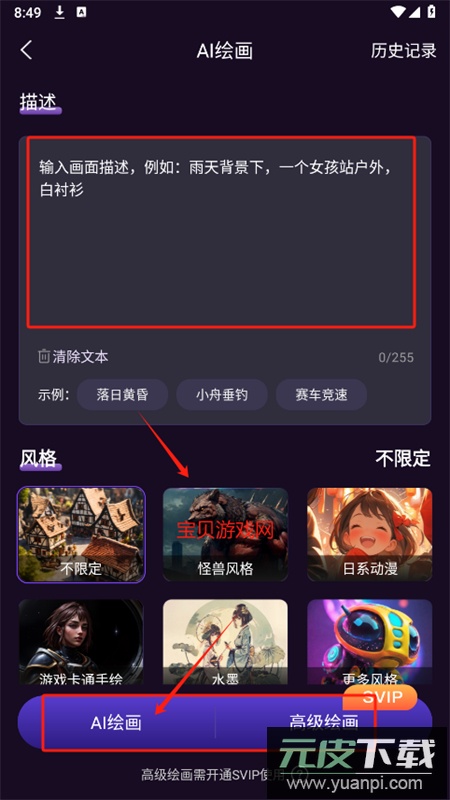 3、使用AI绘画功能时,只需描述想要的画面并选定艺术风格,系统便会快速生成对应图像;