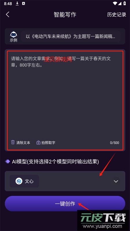 2、进入智能创作板块,输入文章主题或要求,选择合适的AI模型后即可开始自动生成内容;