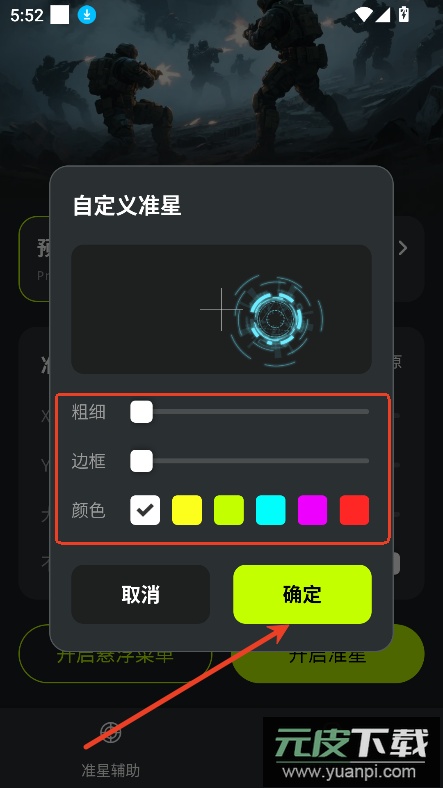 3、进入自定义准星设置,调整边框颜色与线条粗细,完成后点击确定;