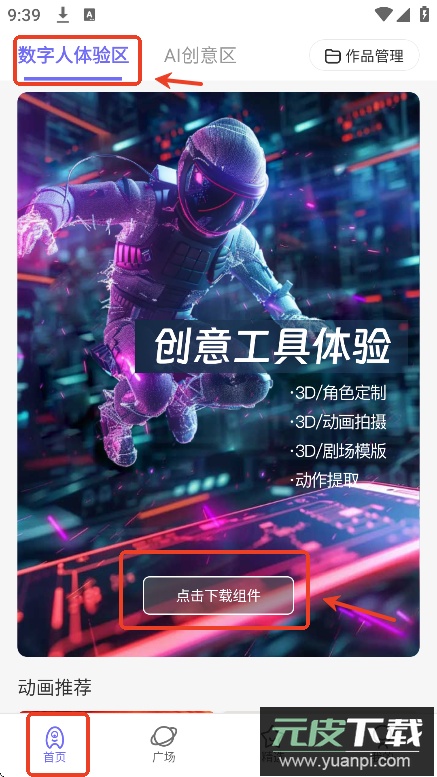 启动应用后,用户可点击首页数字人体验区的“点击下载组件”入口。