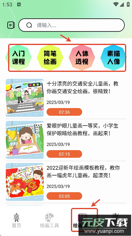 对于希望系统学习绘画的用户,可以在绘画课程页面挑选合适的课程,例如入门基础课或素描人像课等。