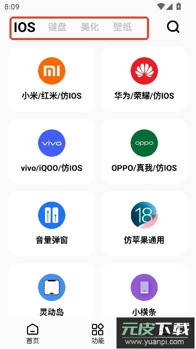 首页设有iOS主题、键盘、壁纸、美化等多个内容板块。