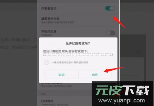 在弹出界面中打开开发者选项与USB调试开关,并按照提示点击允许USB调试。