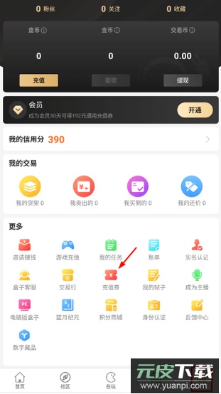 打开996传奇盒子安卓版,进入我的功能模块,选择充值券选项;