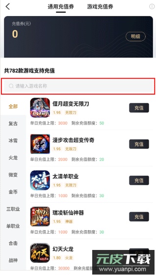 搜索想要充值的游戏,也可通过分类查找目标游戏;