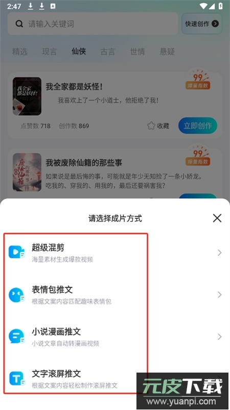 5、在爆文栏目中选择一部小说,点击立即创作,随后挑选合适的视频生成模式。