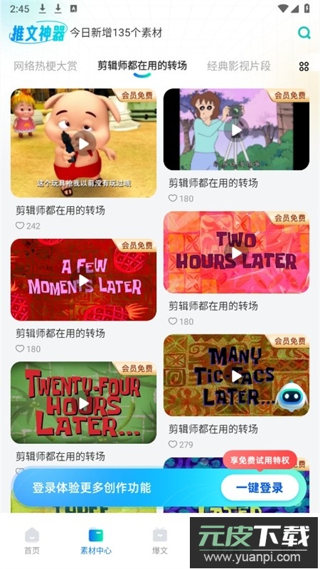 4、素材中心板块准备了大量丰富的素材资源包,用户可根据自身创作主题进行筛选使用。