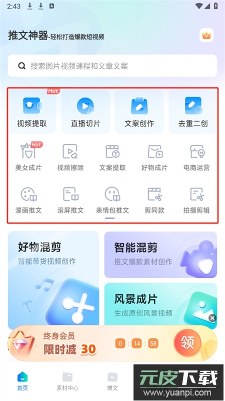 2、主界面集中展示了视频提取、直播切片、文案生成等核心功能入口。