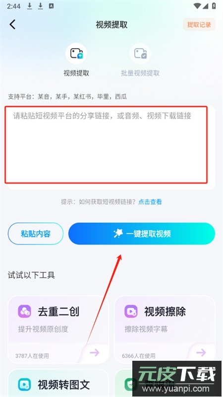 3、进入视频提取功能,粘贴来自短视频平台的分享链接,或直接输入音视频下载地址,点击一键提取即可完成下载。